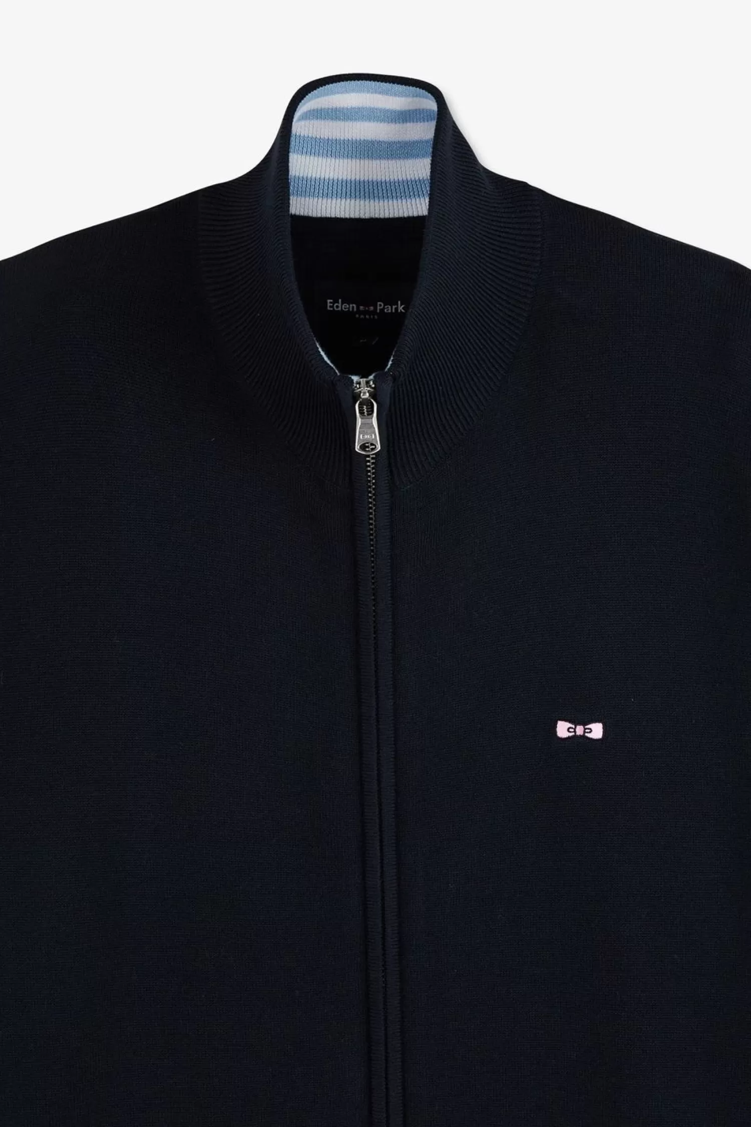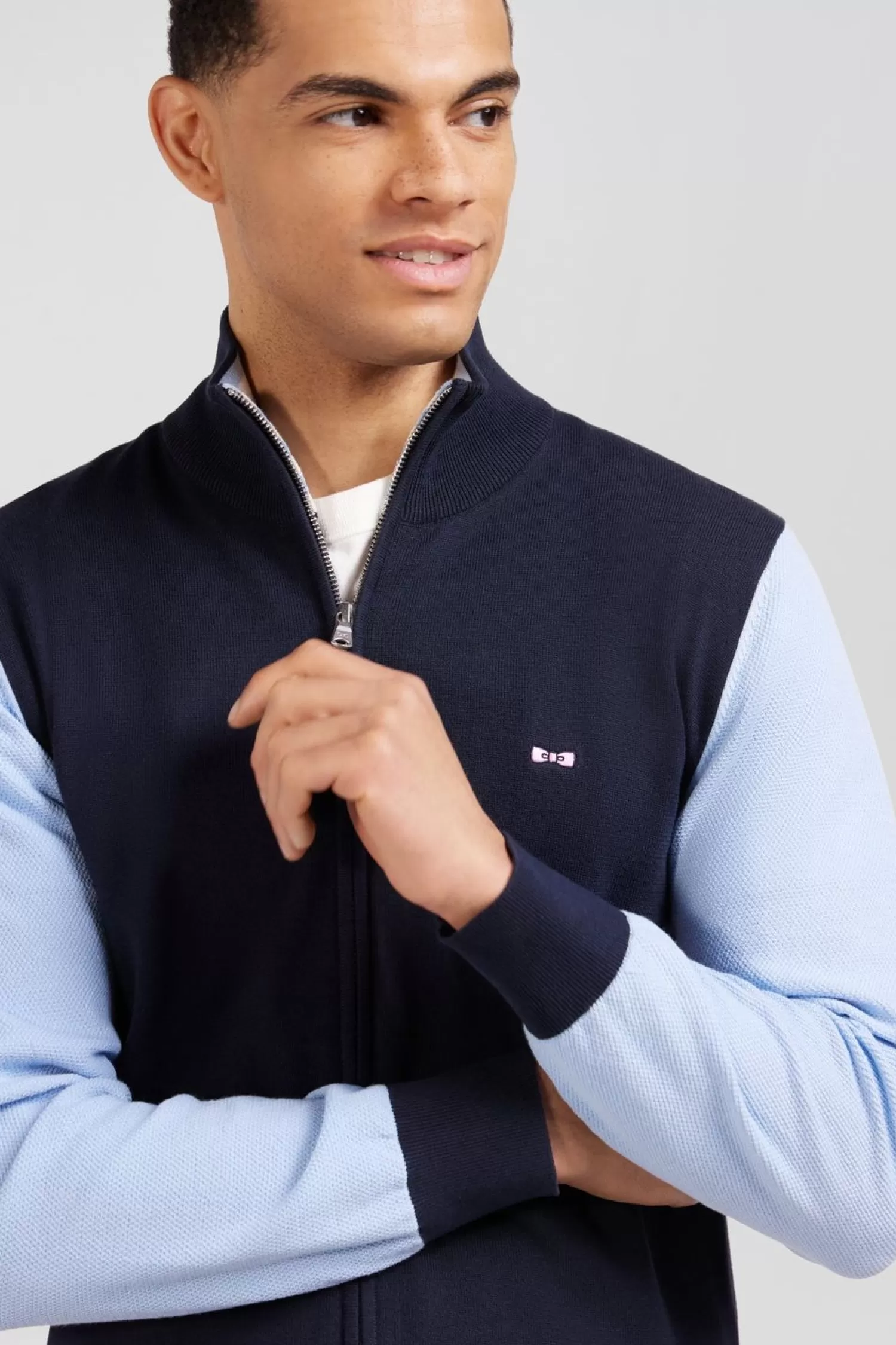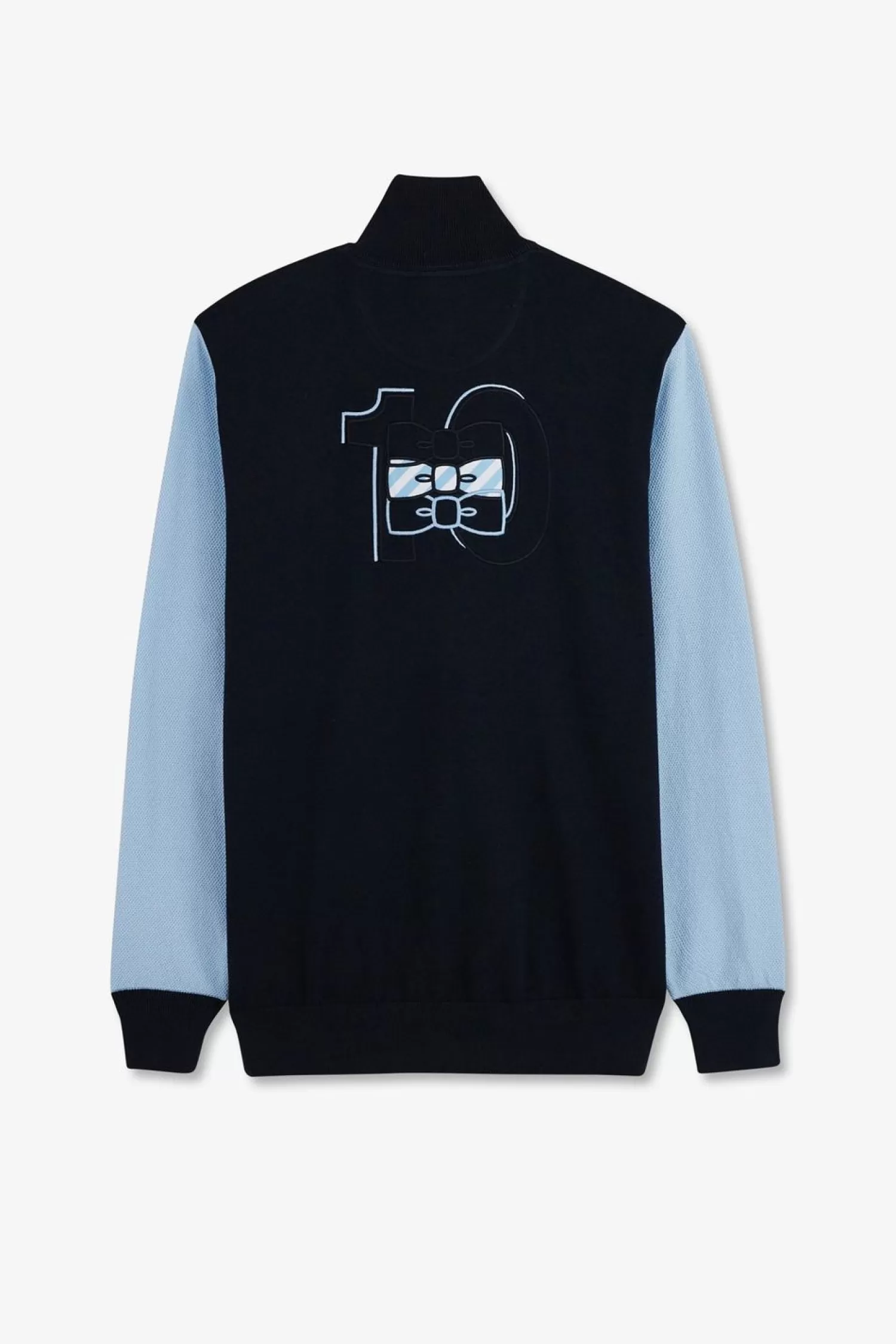 En Version Marine Ou Bicolore Marine Et Bleu, Ce Cardigan À Zip Droit Promet Une Allure Décontractée Savamment Travaillée. Son Intérieur De Col Cerclé De Rayures Répond À Son Motif Dos Revisitant L’Emblématique Numéro 10, Maillot Historiquement Porté Par Notre Fondateur Franck Mesnel.
