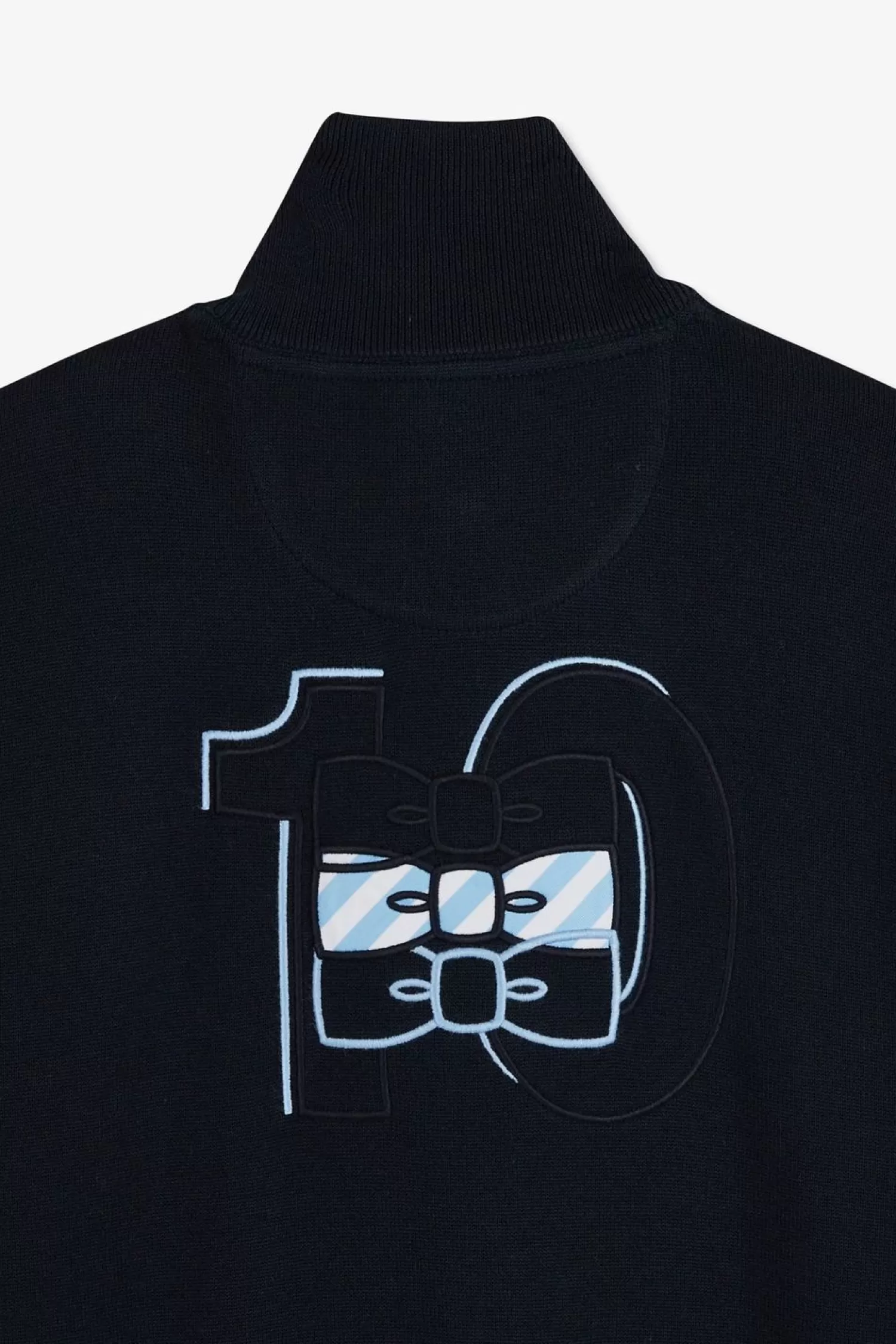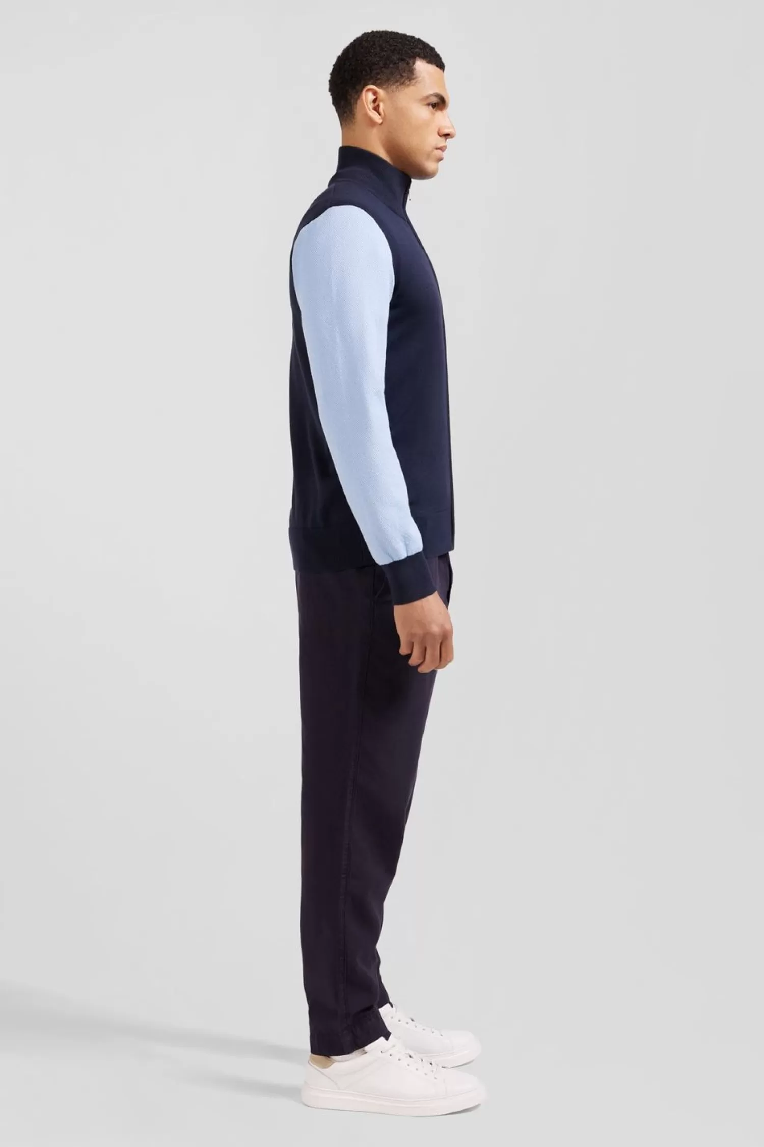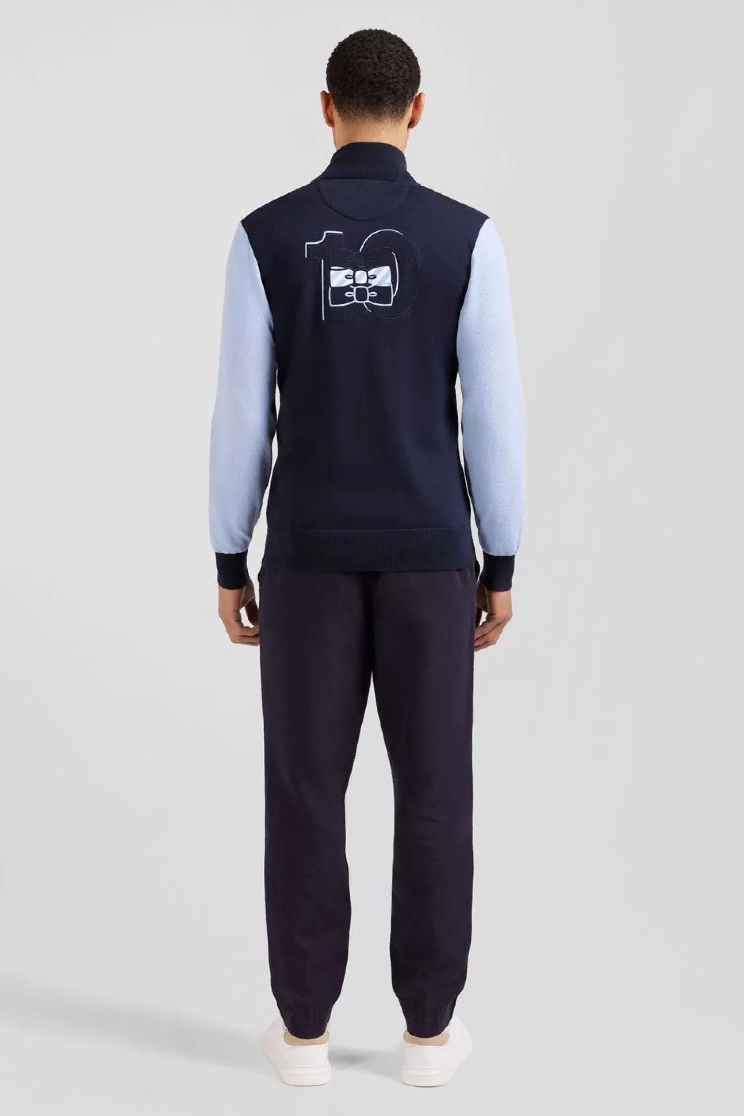 En Version Marine Ou Bicolore Marine Et Bleu, Ce Cardigan À Zip Droit Promet Une Allure Décontractée Savamment Travaillée. Son Intérieur De Col Cerclé De Rayures Répond À Son Motif Dos Revisitant L’Emblématique Numéro 10, Maillot Historiquement Porté Par Notre Fondateur Franck Mesnel.