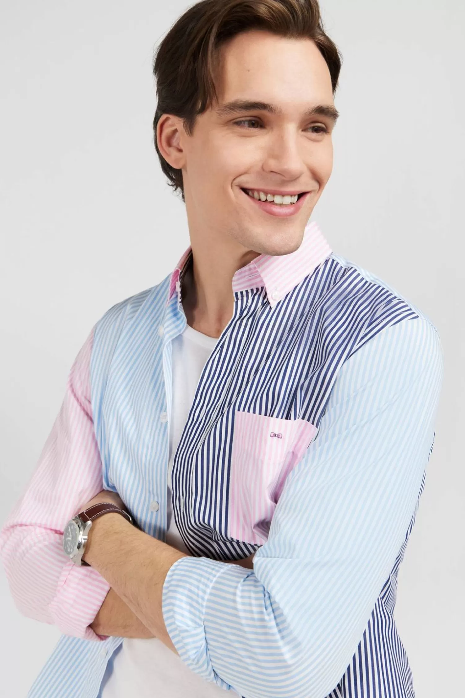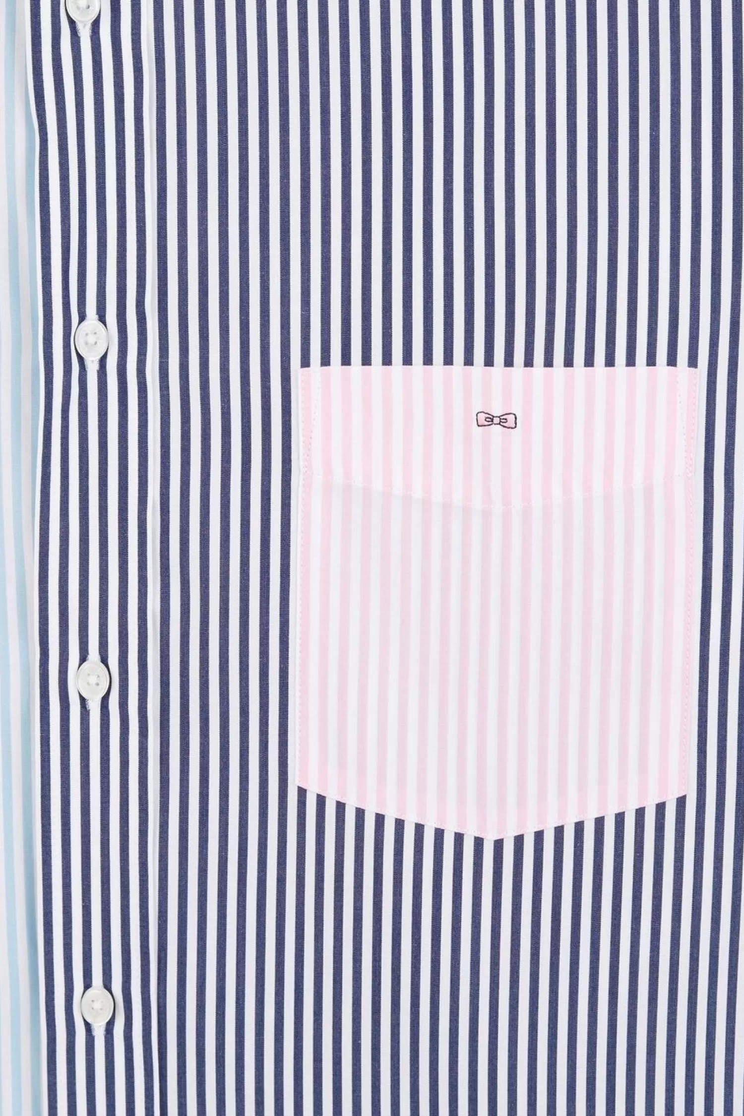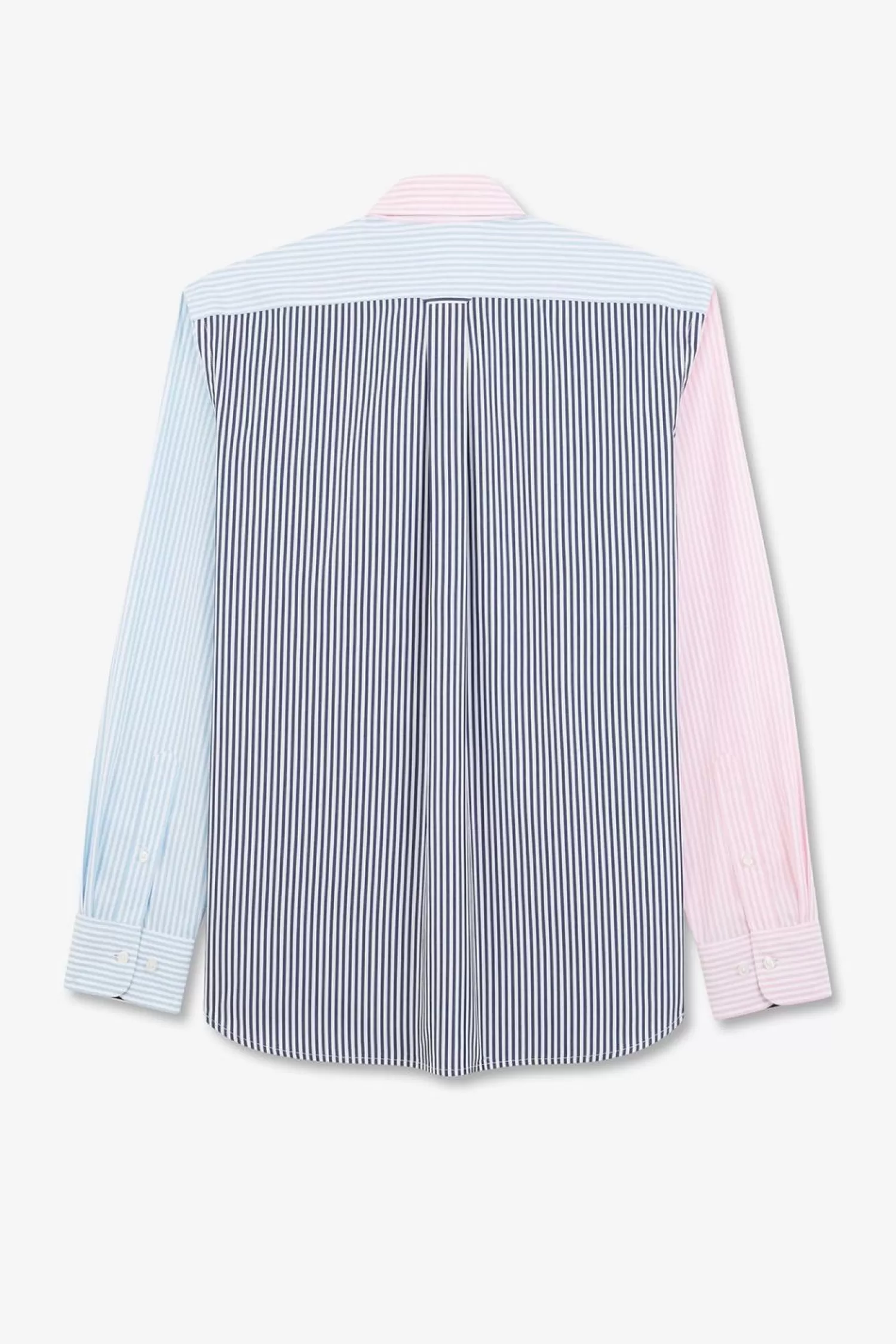 Cette Chemise Originale Avec Son Look Colorblock À Rayures Affiche Le Noeud Papillon Emblématique Brodé Sur La Poitrine