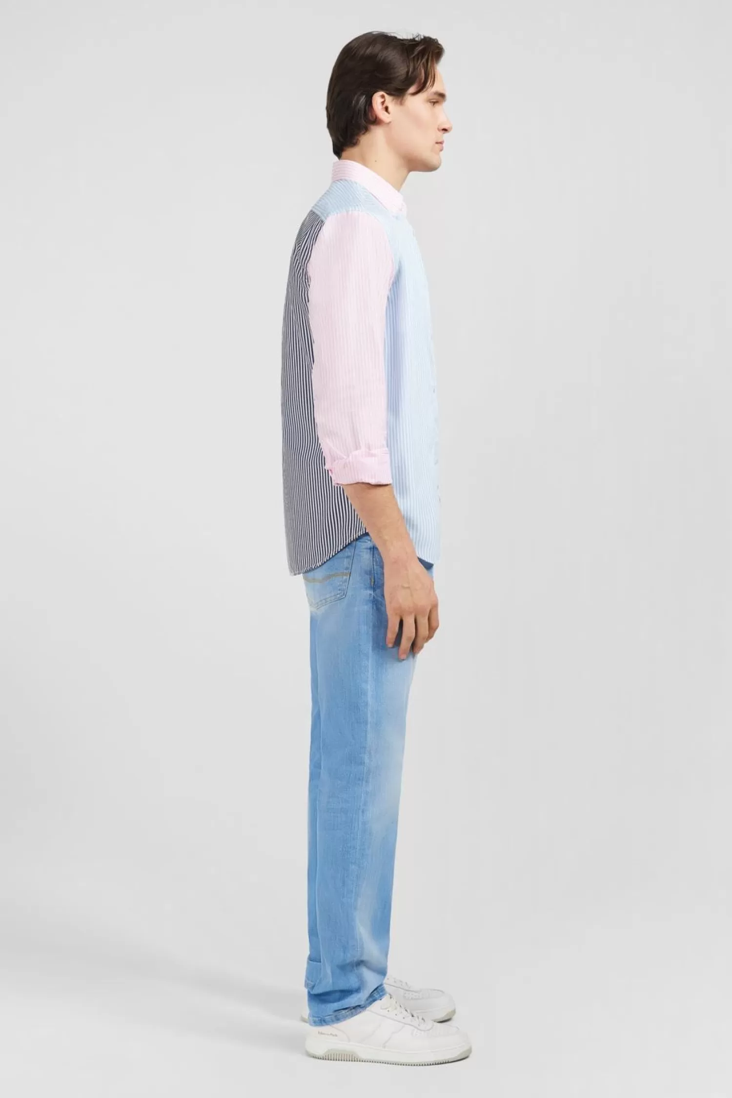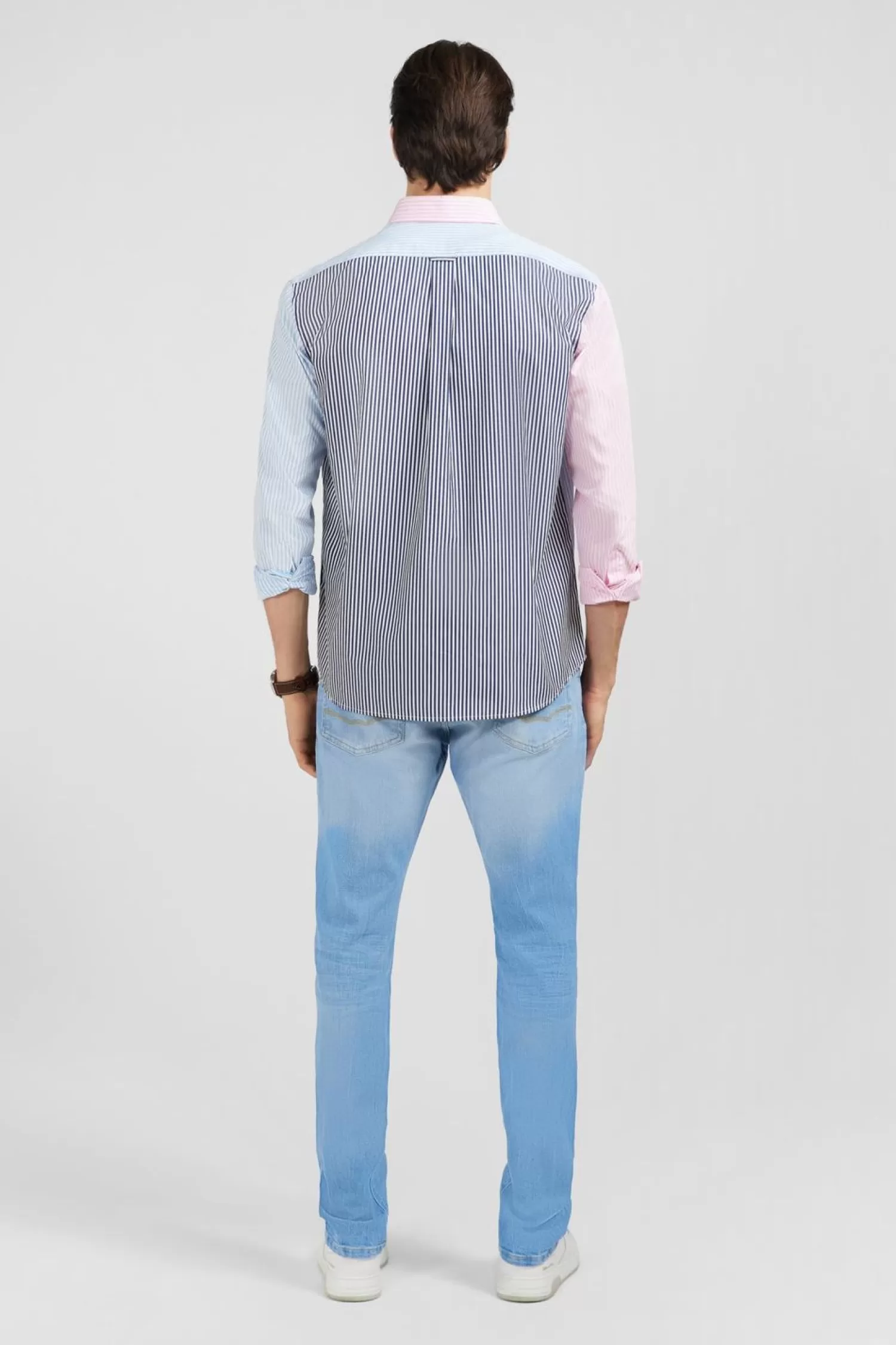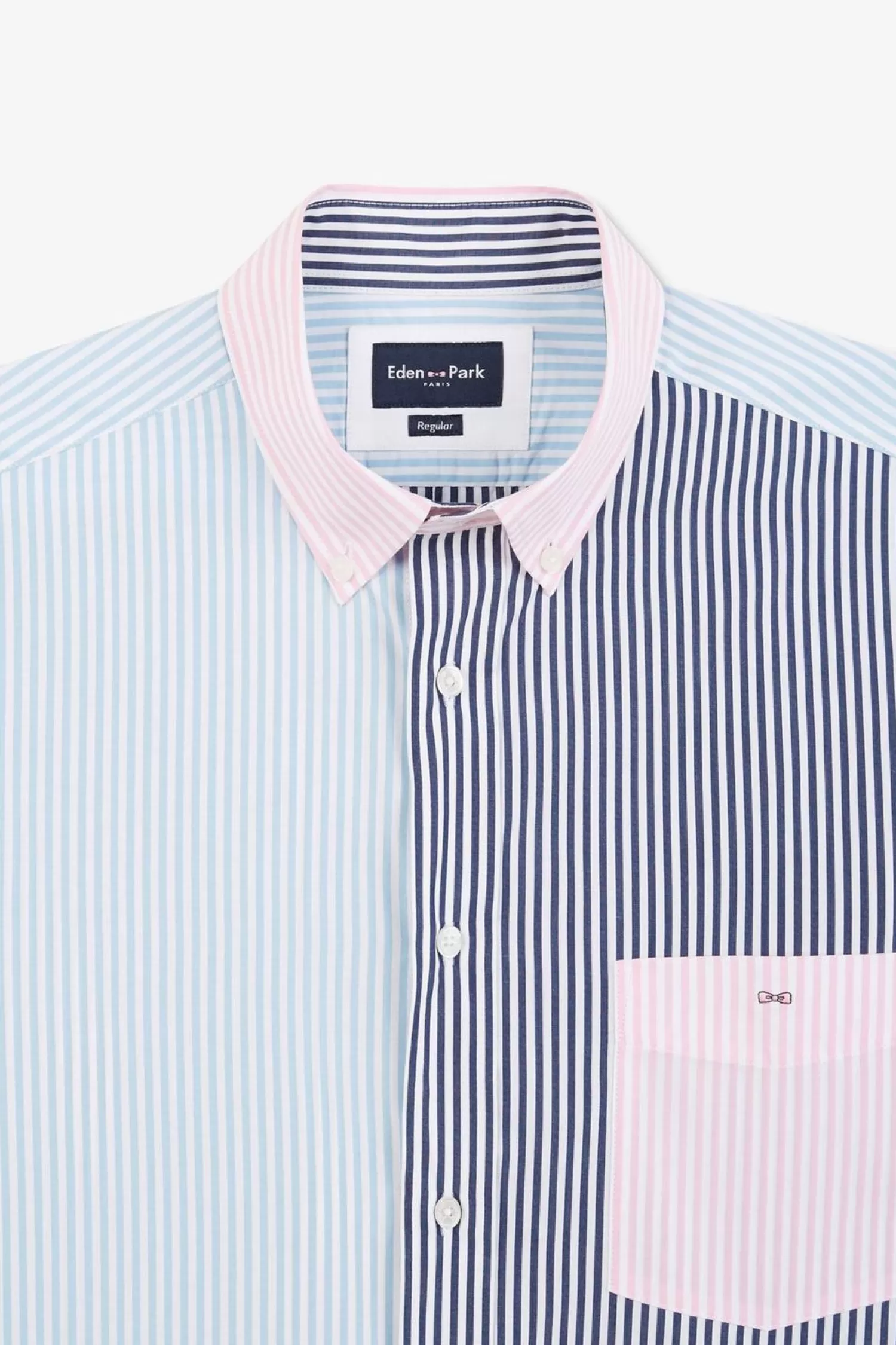 Cette Chemise Originale Avec Son Look Colorblock À Rayures Affiche Le Noeud Papillon Emblématique Brodé Sur La Poitrine