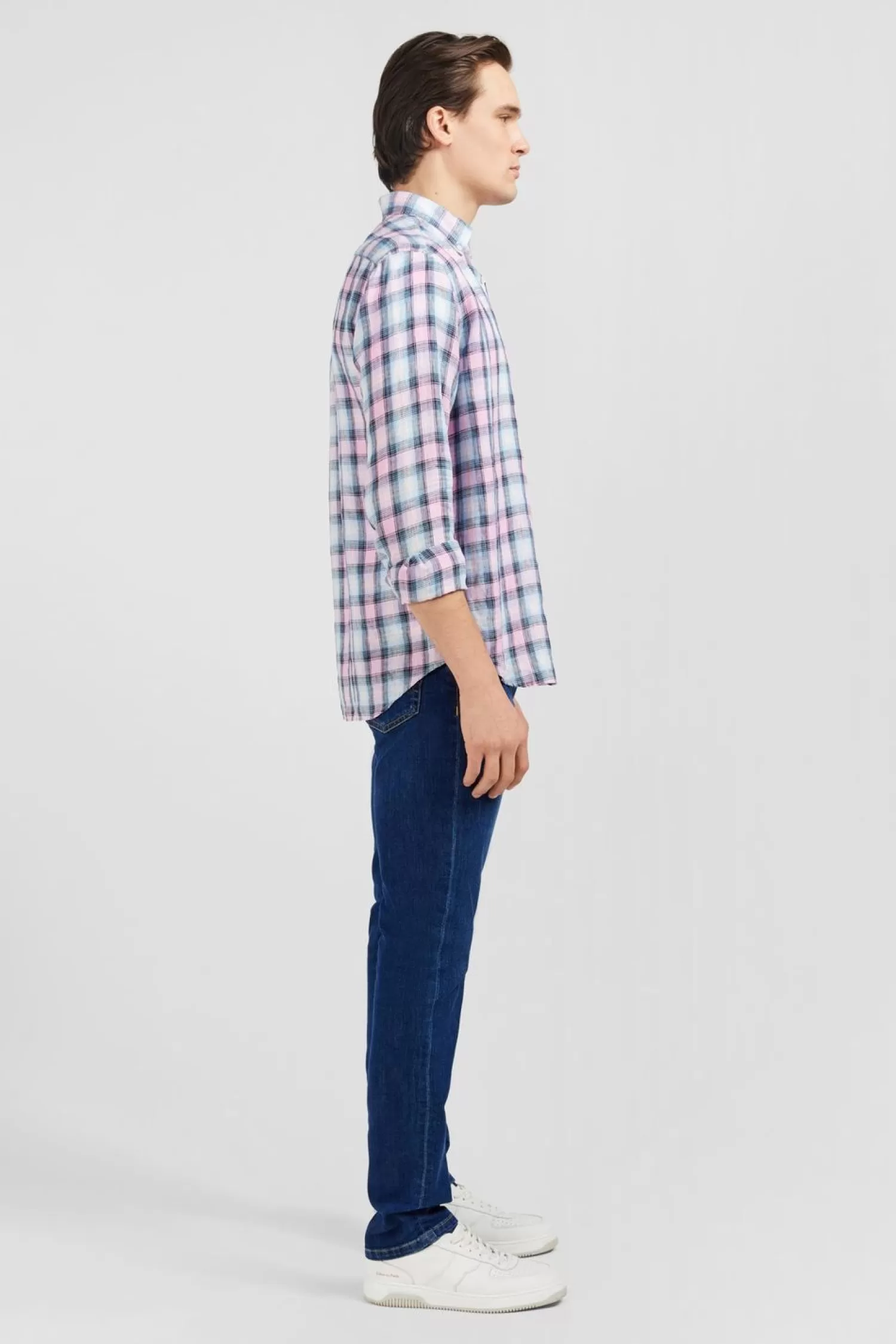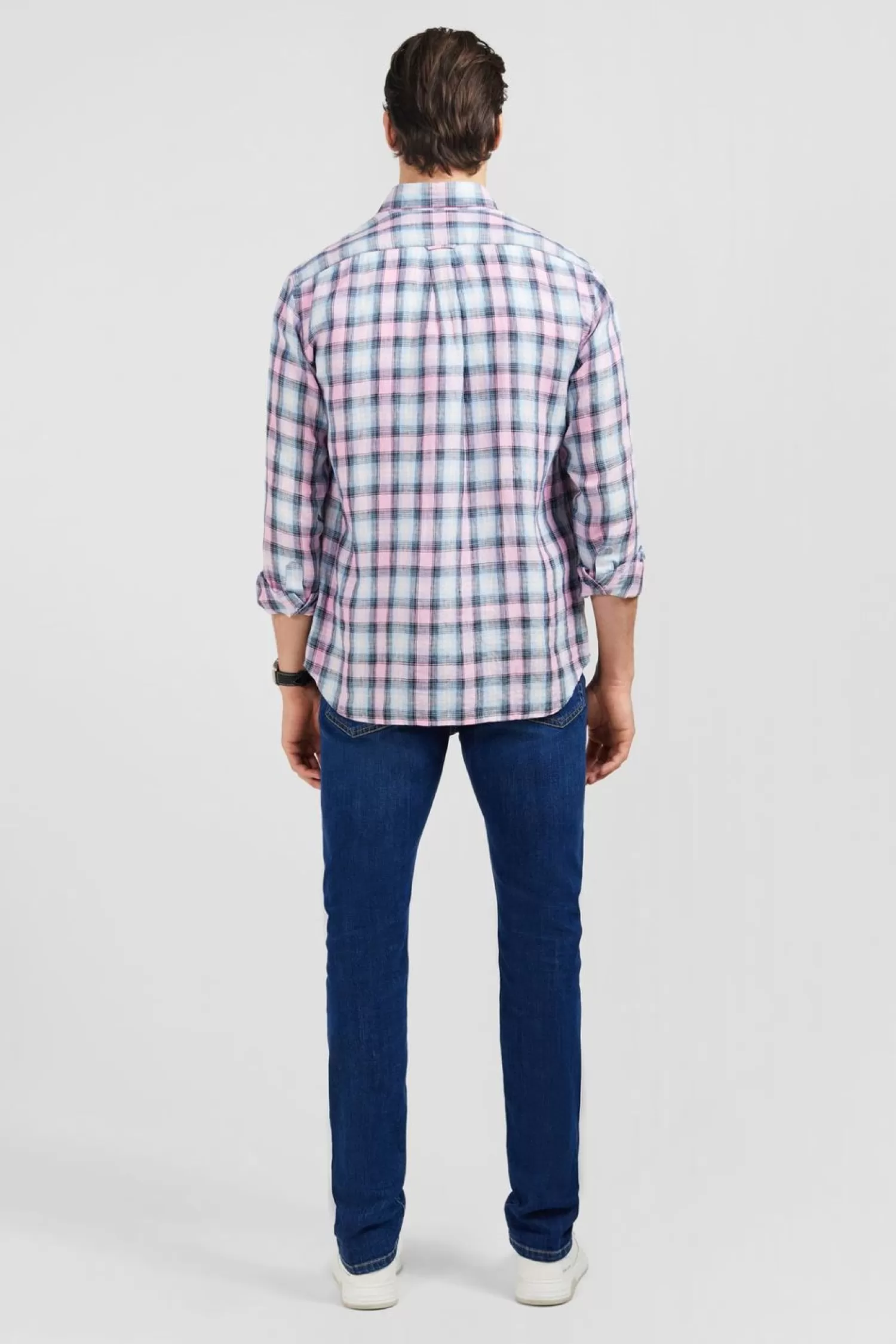 Cette Chemise En Lin Est Douce Et Agréable À Porter. Elle Présente Un Motif À Carreaux Où Se Fond Une Poche Plaquée Sur La Poitrine, Subtilement Rehaussée D’Une Broderie Nœud Papillon Rose