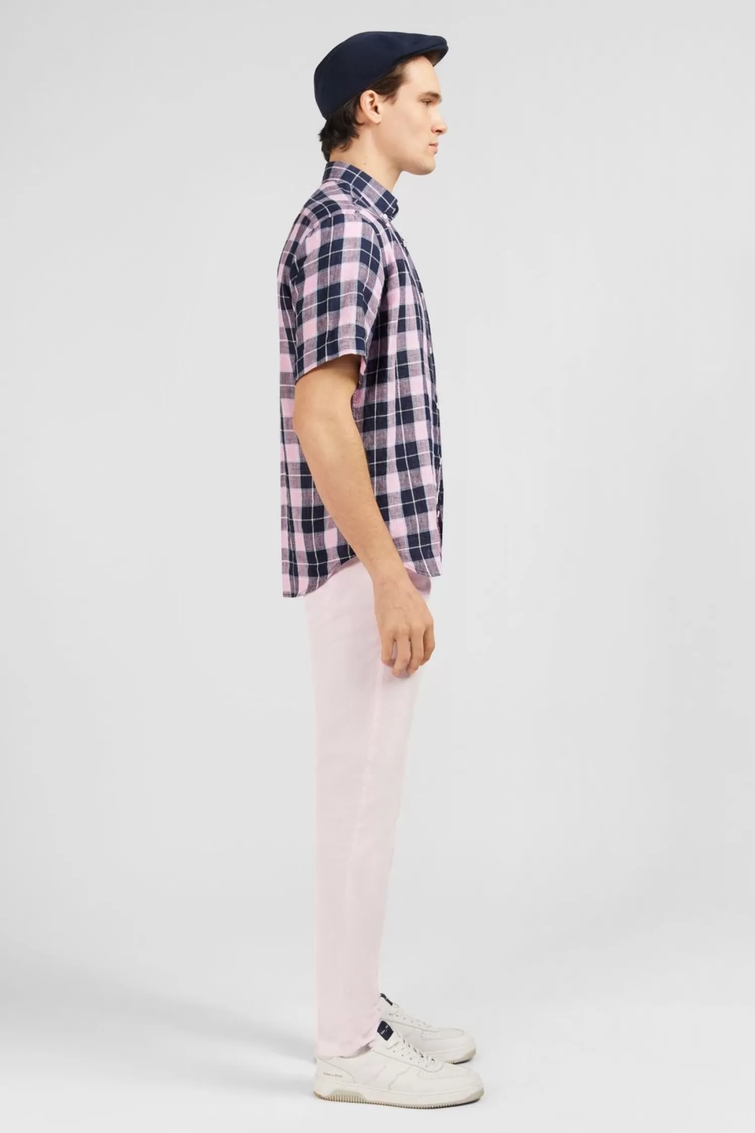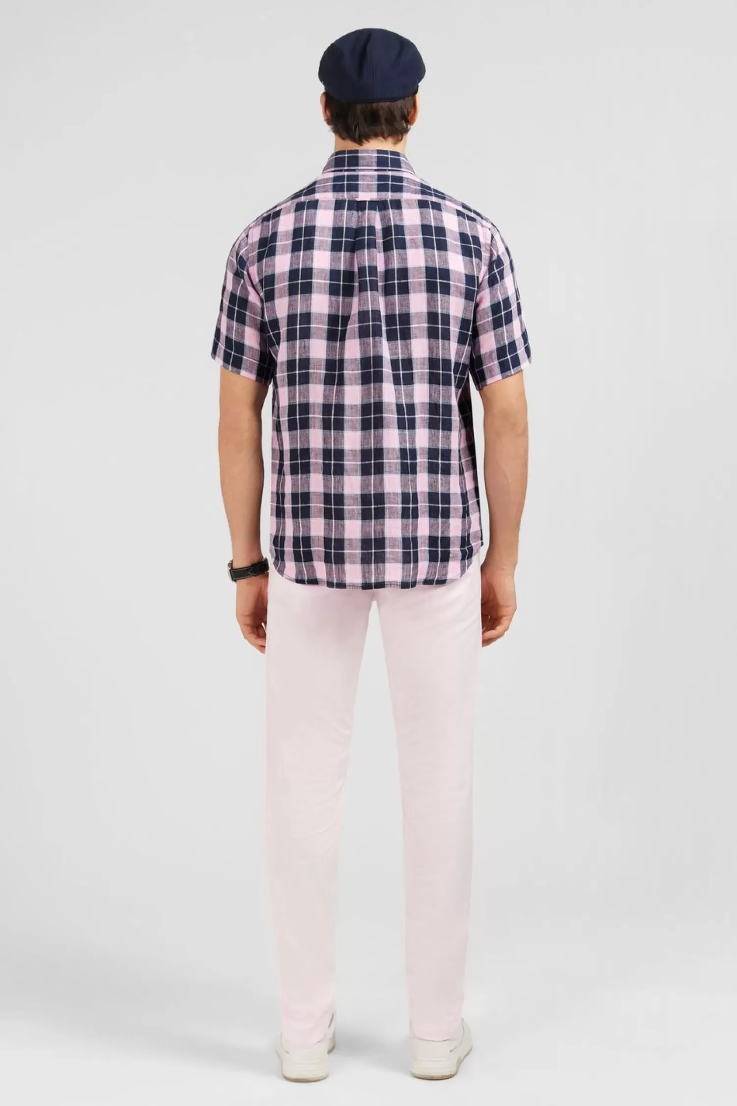 Cette Chemisette En Lin Est Douce Et Légère. Elle Présente Un Motif À Carreaux Et Affiche Une Poche Discrètement Plaquée À La Poitrine, Subtilement Rehaussée D’Une Broderie Nœud Papillon