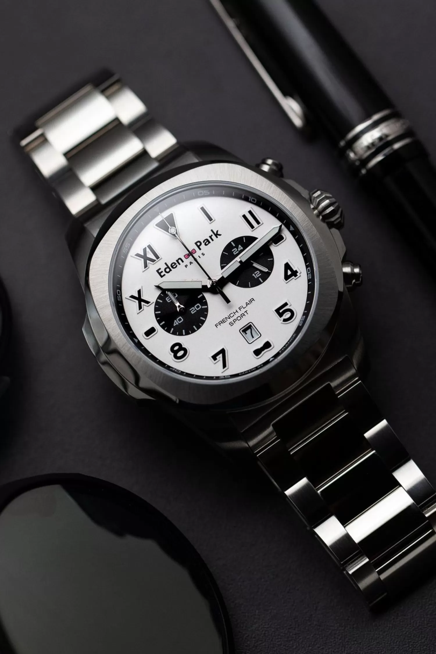 Cette Montre À Quartz Est Pleine De Fonctionnalités Avec Ses Deux Compteurs Propres Aux Chronographes. Elle Dispose D’Un Boîtier En Acier Et D’Un Cadran Gris Divisé En Deux Affichages, Sur Le Haut En Chiffres Romains Et Sur Le Bas En Chiffres Arabes. Le Cadran Offre Un Affichage Index Bâtons Et Indique La Date Du Jour. Le Bracelet Est En Acier Avec Fermeture Par Boucle Déployante