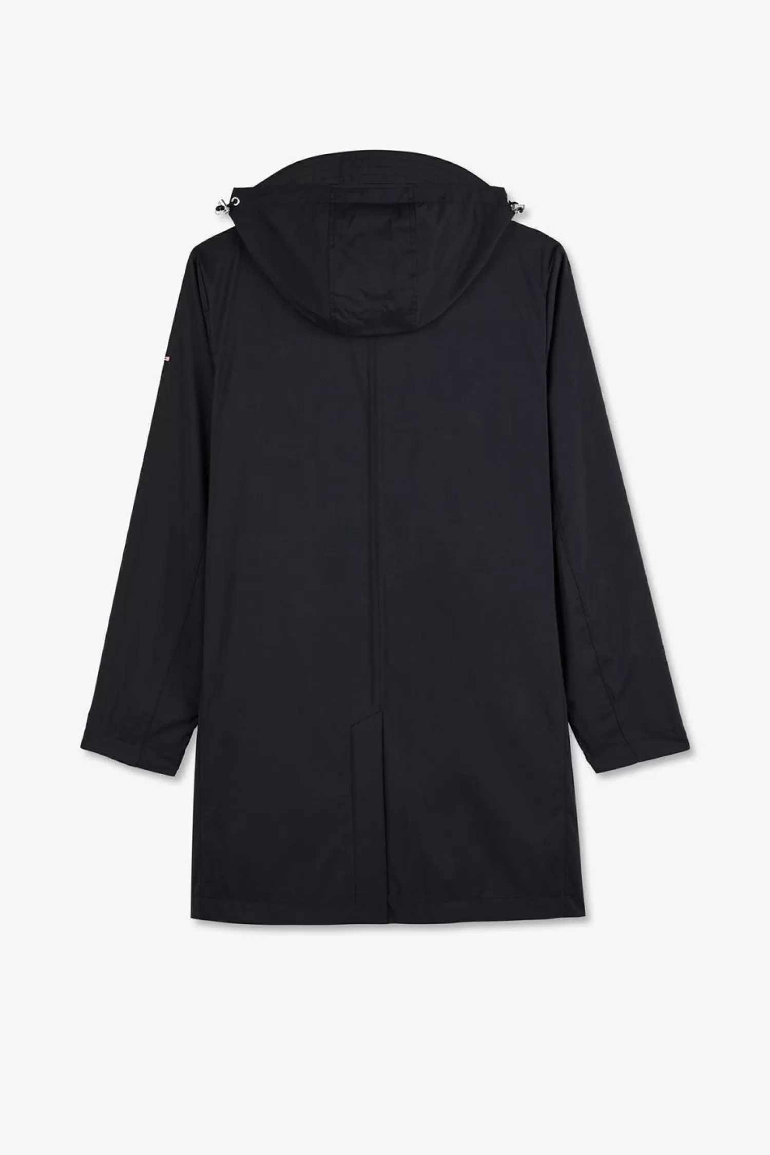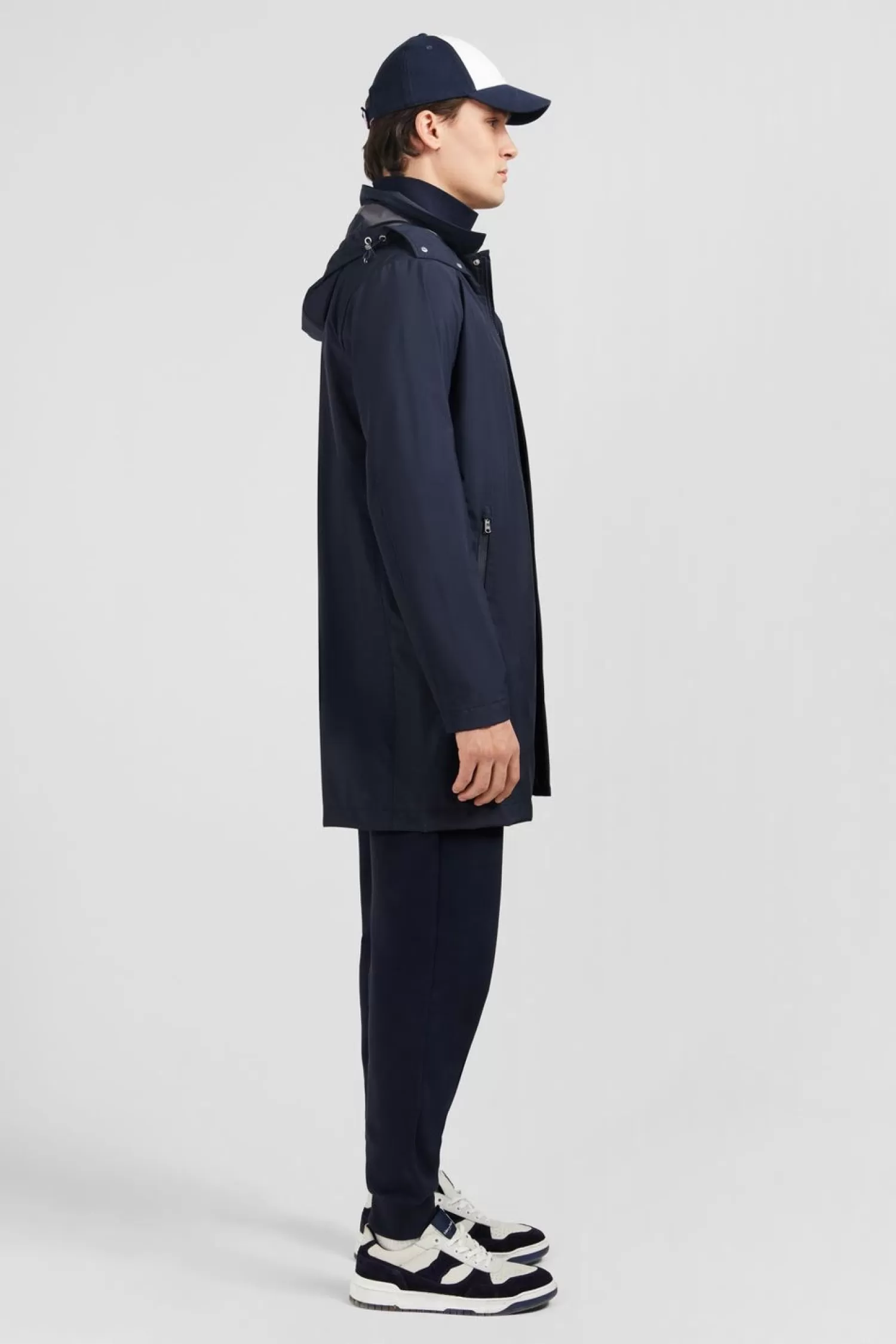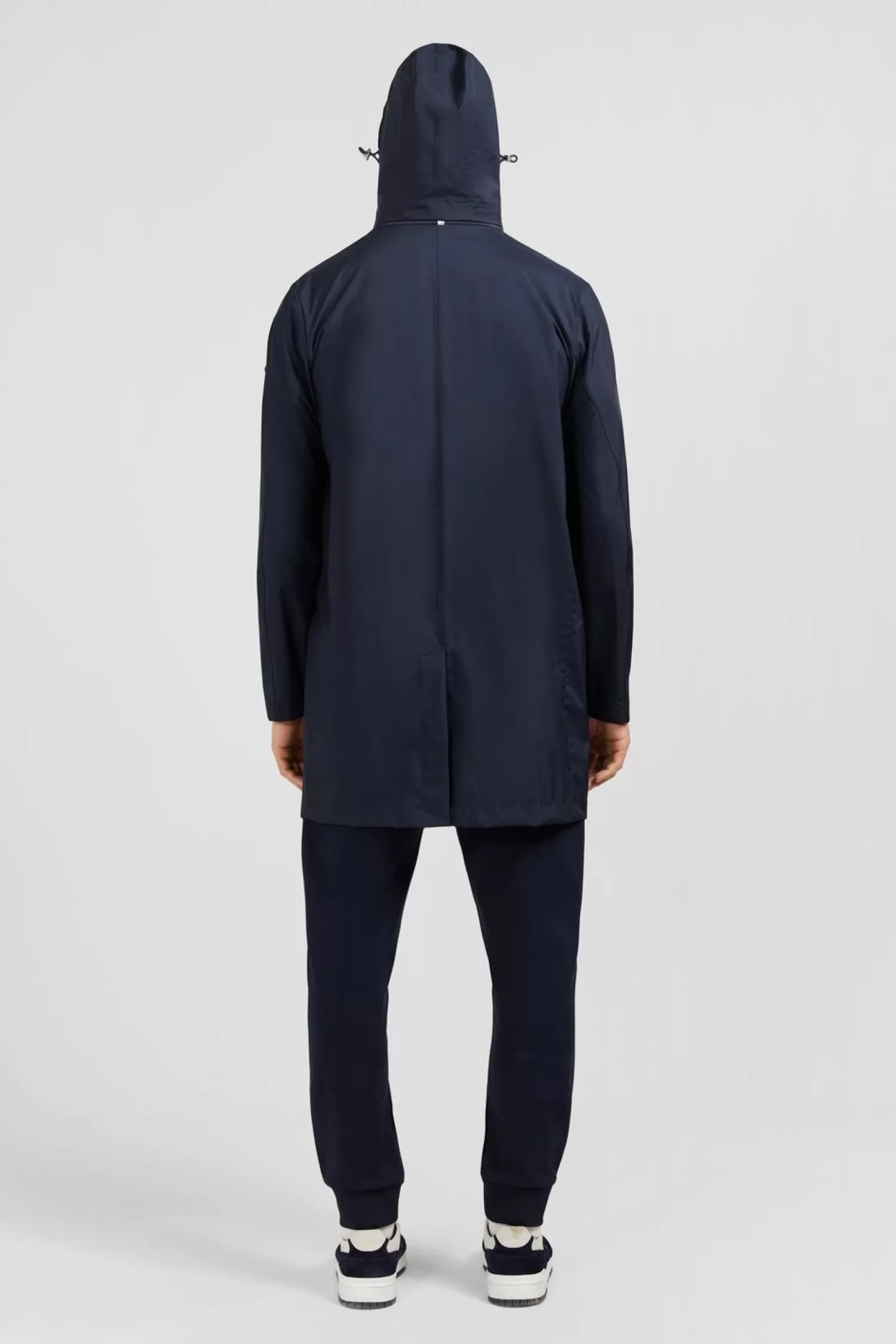 Cette Parka Homme En Tissu Bleu Marine Déperlant Offre Un Style Polyvalent, Alliant Élégance Et Confort. Sa Capuche Amovible Comporte Des Cordons De Resserrage Et Un Col À Double Pression Pour Un Porté Ajusté. Sa Fermeture À Double Zip Est Complétée D’Une Patte De Boutonnage À Boutons Pression Siglés Pour Une Isolation Optimale.
