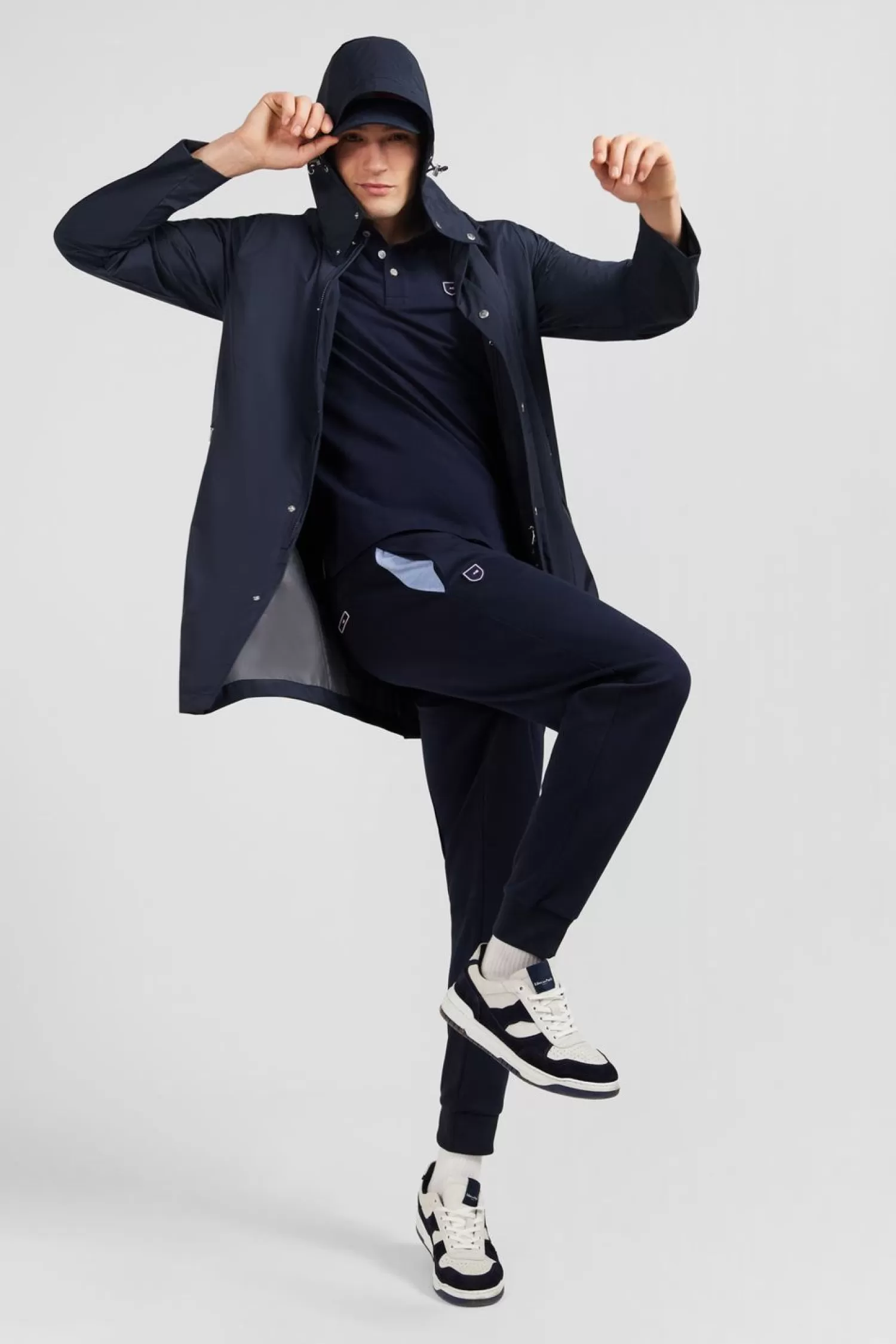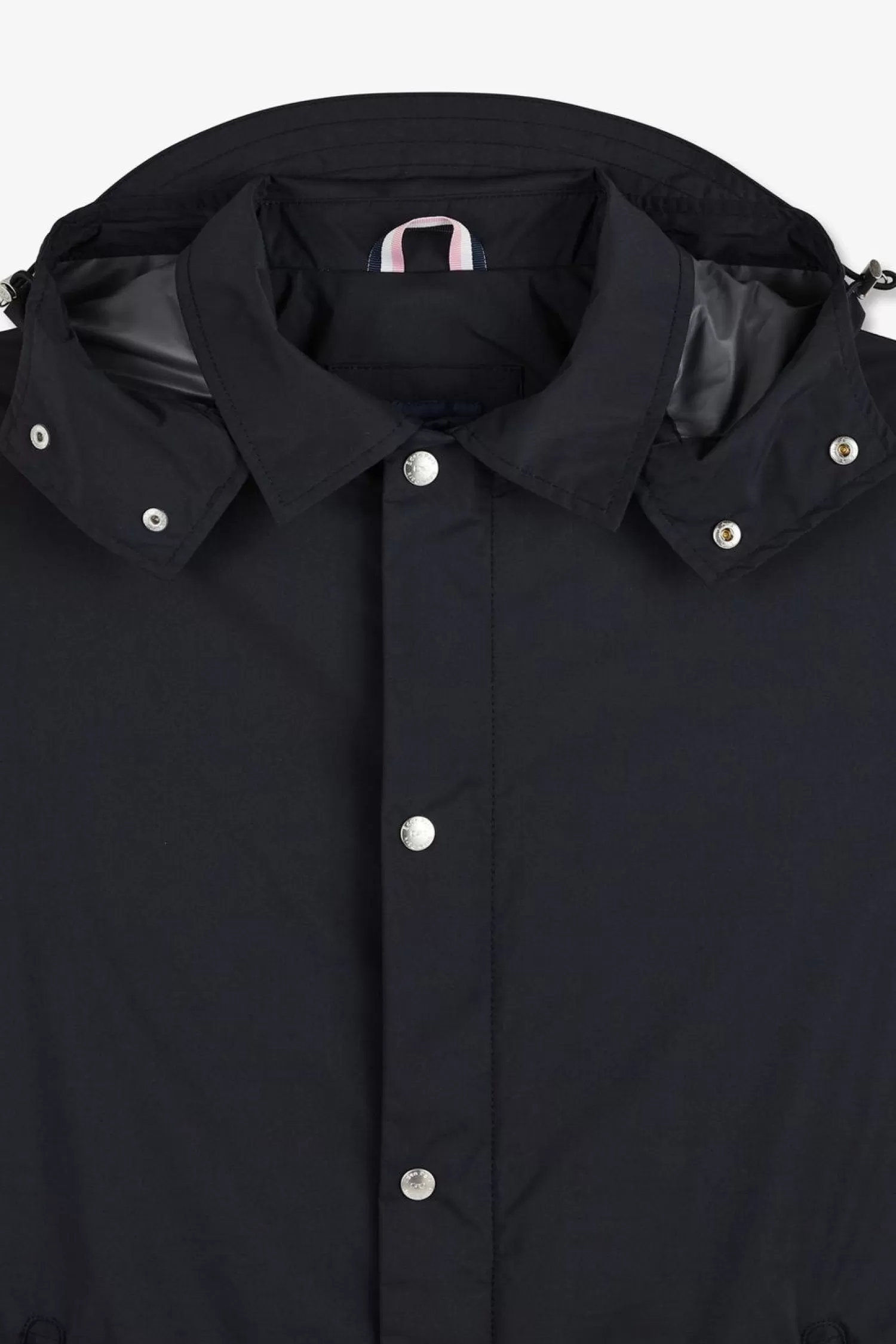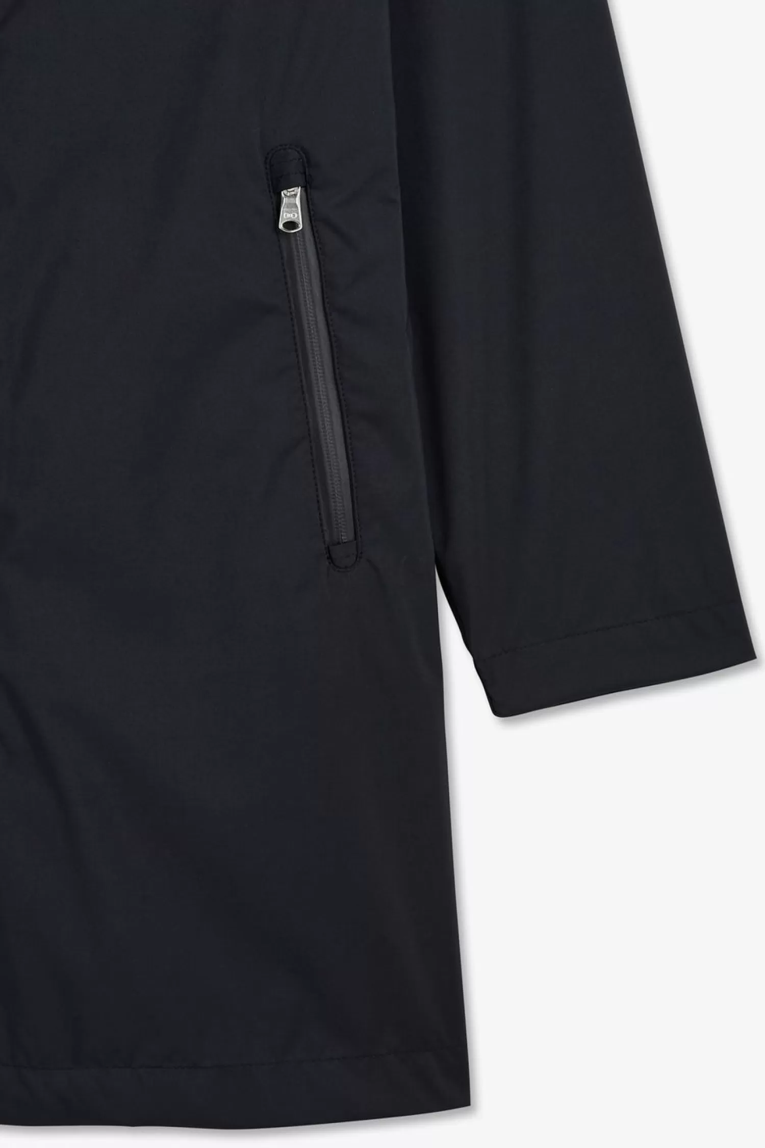 Cette Parka Homme En Tissu Bleu Marine Déperlant Offre Un Style Polyvalent, Alliant Élégance Et Confort. Sa Capuche Amovible Comporte Des Cordons De Resserrage Et Un Col À Double Pression Pour Un Porté Ajusté. Sa Fermeture À Double Zip Est Complétée D’Une Patte De Boutonnage À Boutons Pression Siglés Pour Une Isolation Optimale.