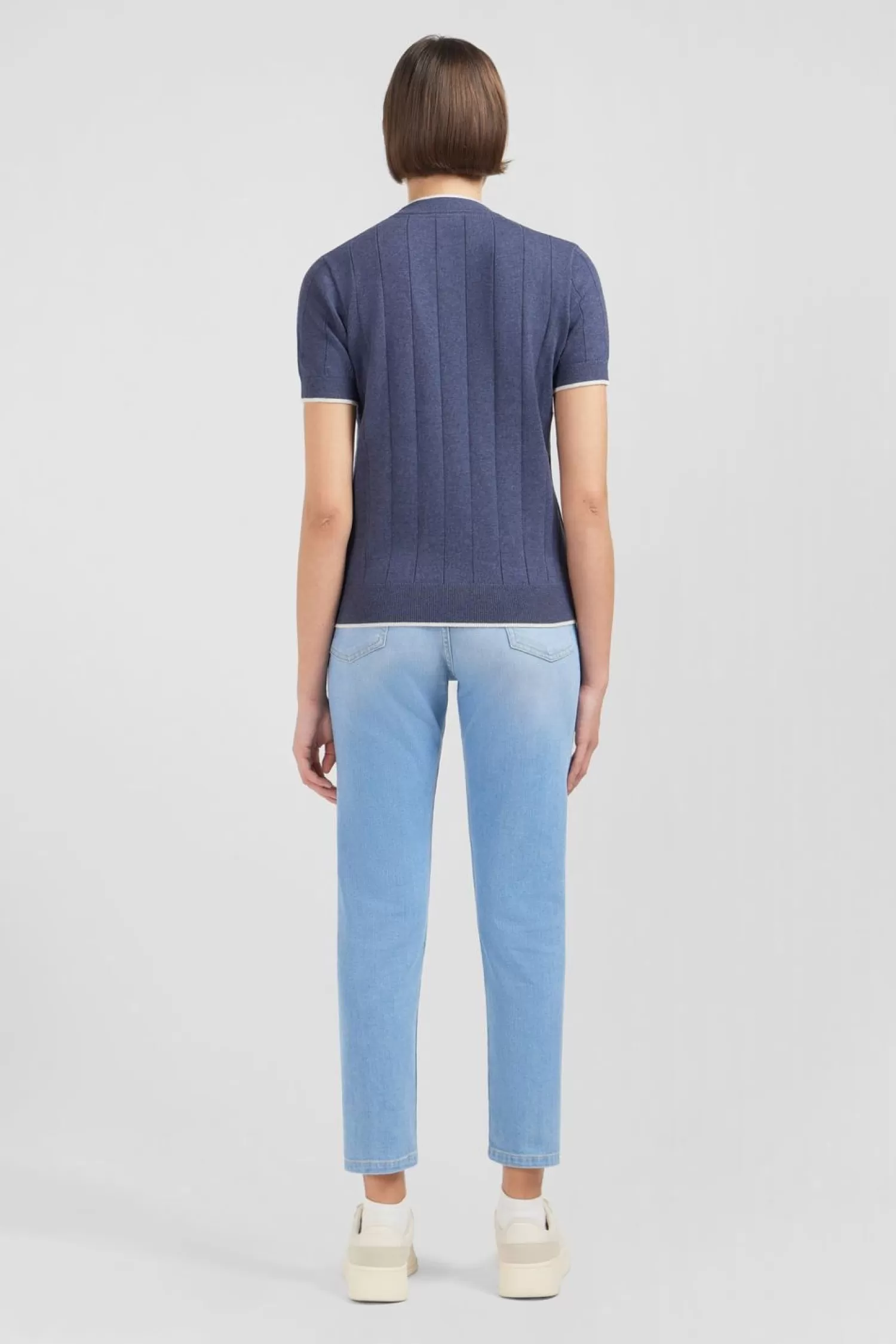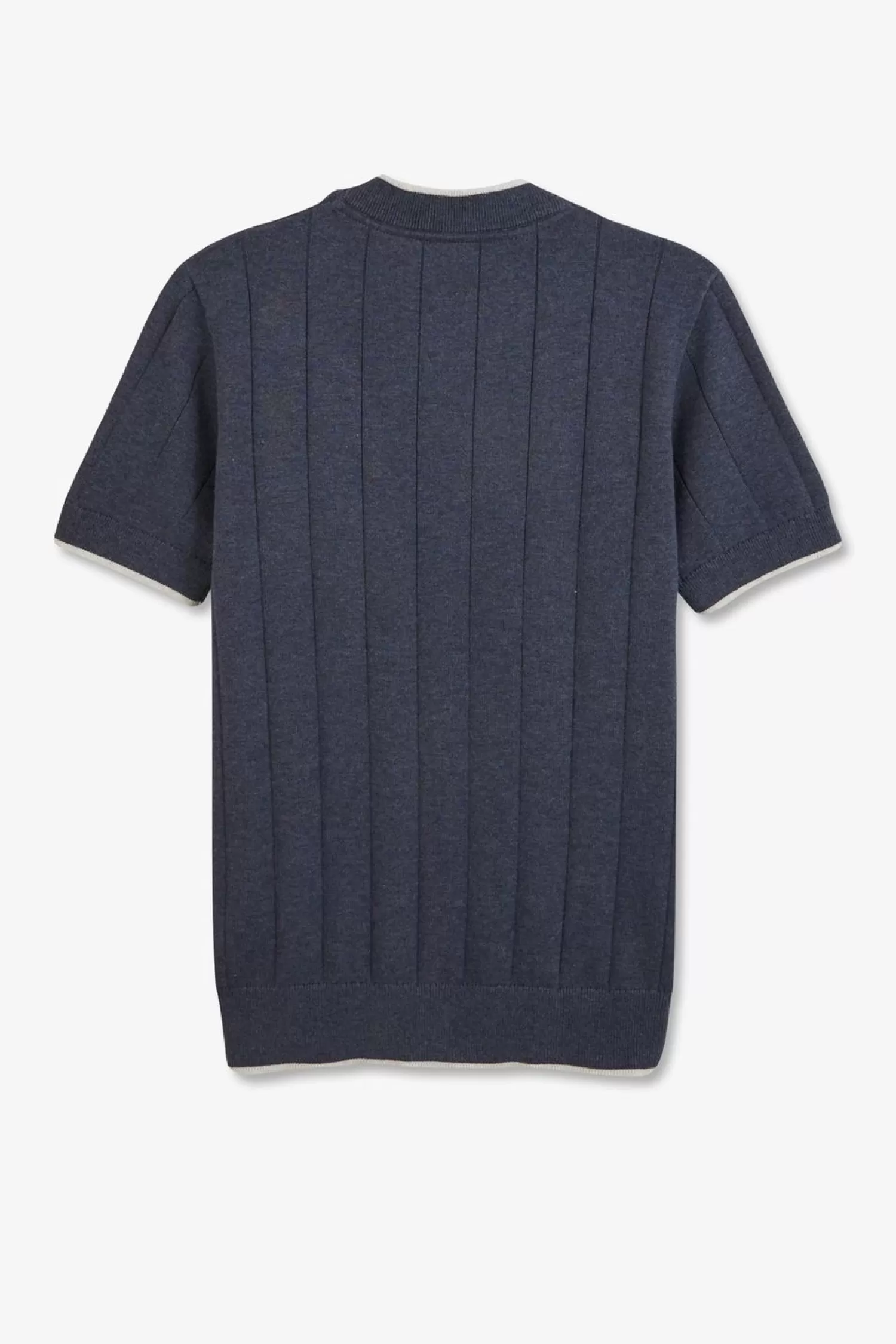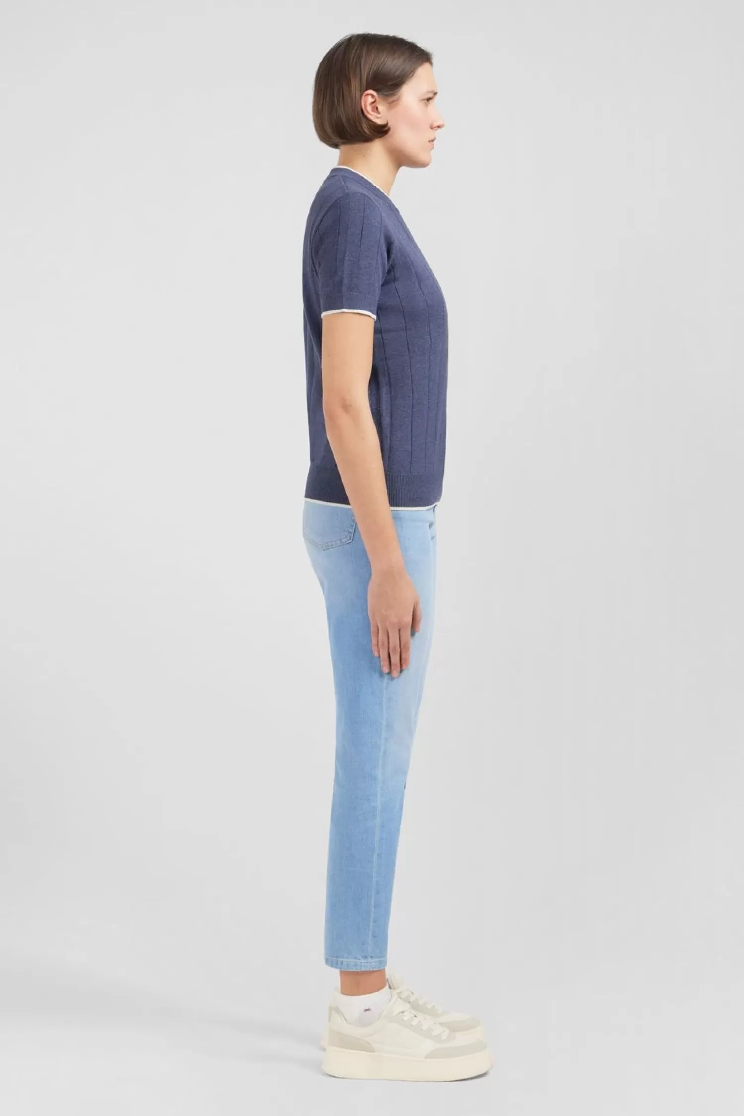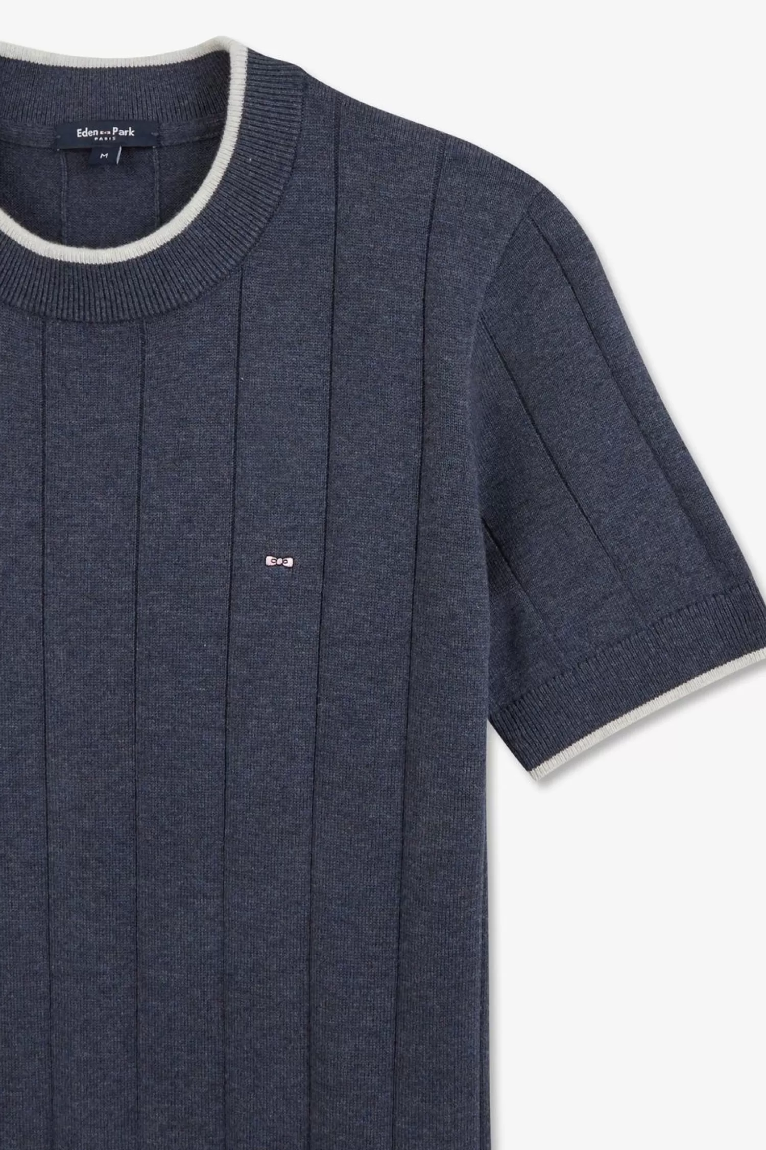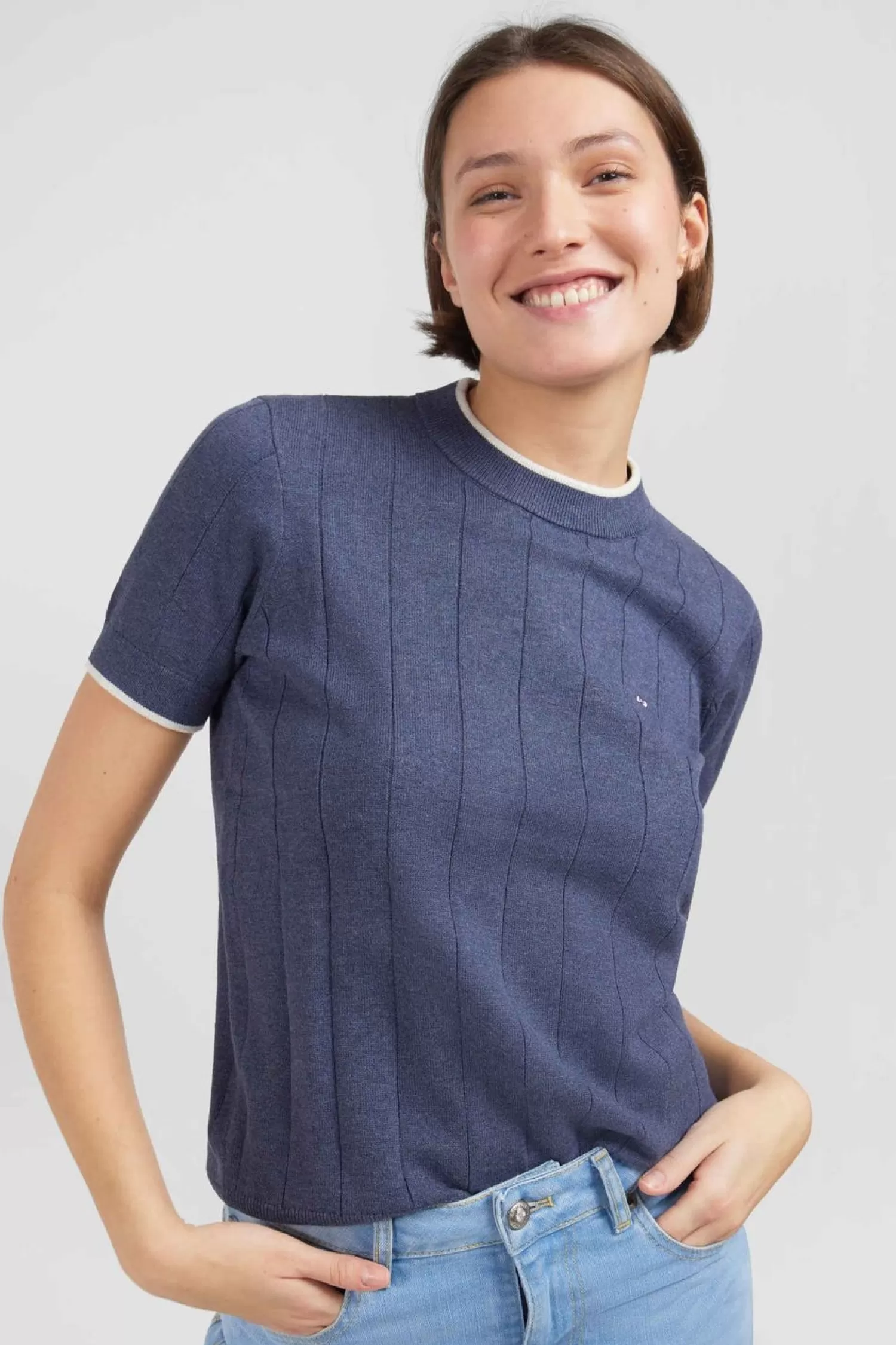 Confectionné En Pur Coton, Ce Pull À Manches Courtes Affiche De Belles Et Fines Rayures En Jeu De Maille Sous Forme De Bandes Horizontales