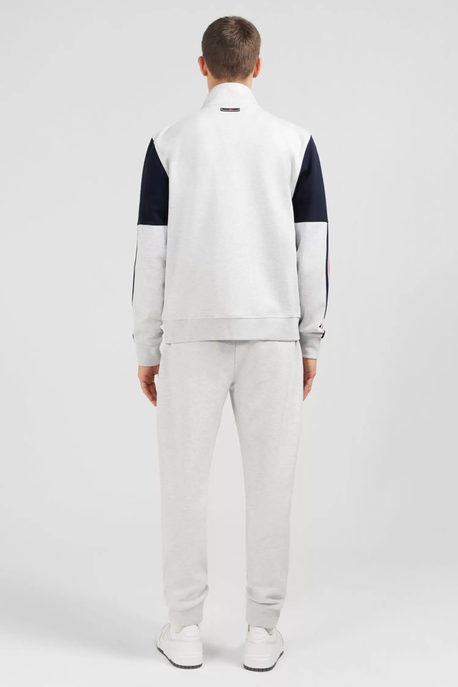 Ce Sweat Garantit Confort Et Résistance Grâce À Sa Confection En Coton Épais Avec Des Empiècements Déperlants Et Matelassés Sur Le Devant. Il Est Doté D’Un Col Montant Bien Couvrant, D’Une Fermeture Et De Poches Zippées Et Affiche Un Badge Logo Écusson Sur La Poitrine. On Note Les Bandes Tricolores À L’Intérieur Du Col Et Au Niveau Des Manches