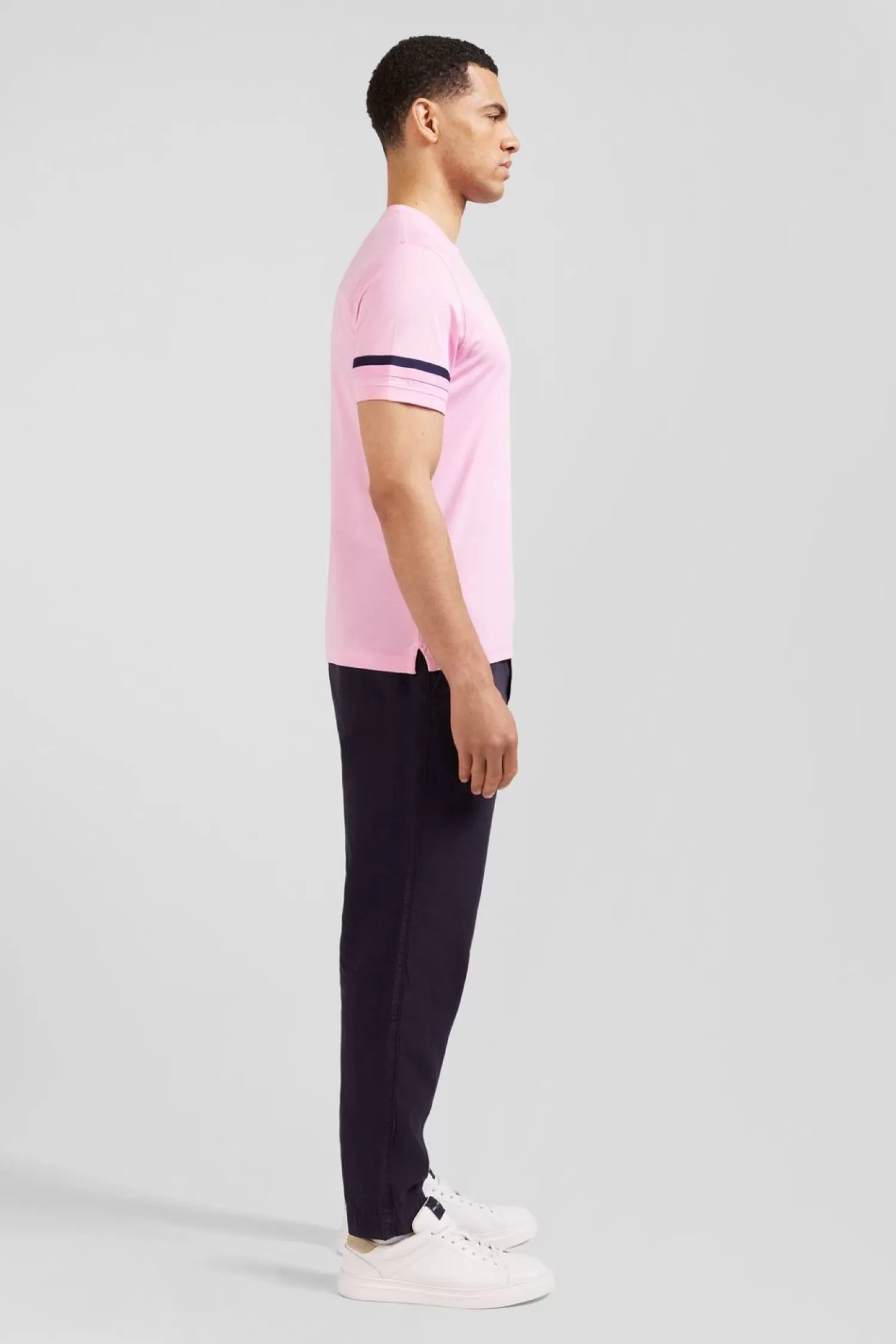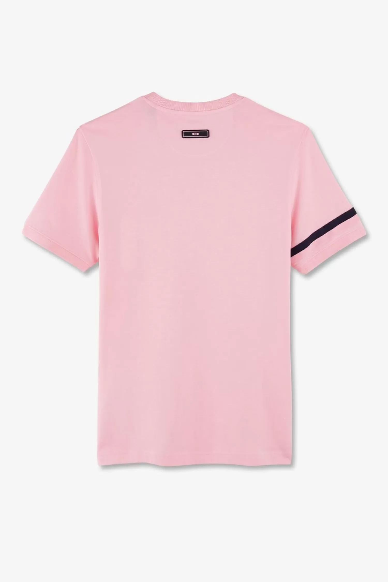 Dans Son Coloris Rose Iconique, Ce T-Shirt Pour Homme Arbore Deux Écussons Marine En Gomme Portant L’Emblème Nœud Papillon Et Le Nom De Notre Maison. L’Un Est Positionné Sur La Poitrine Offrant Un Rappel Discret De Ses Détails Rayés Aux Manches Tandis Que L’Autre Se Révèle Sur L’Arrière De Cette Pièce.